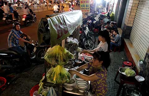 Người bán bún bò Huế có quyền bán, ghi biển hiệu quảng bá món truyền thống này miễn không sử dụng logo của Huế. Trong ảnh: Một quán bún bò trên đường Trường Chinh, quận Tân Bình. (Ảnh chụp tối 7-8) Ảnh: HOÀNG GIANG