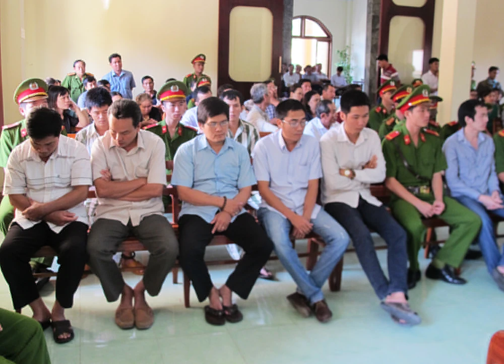 Các bị cáo gục đầu khi nghe gia đình bị hại bức xúc trình bày. Ảnh: TẤN LỘC