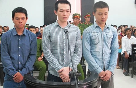 Ba bị cáo đánh chết em Tu Ngọc Thạch trước vành móng ngựa. Ảnh: Tấn Lộc