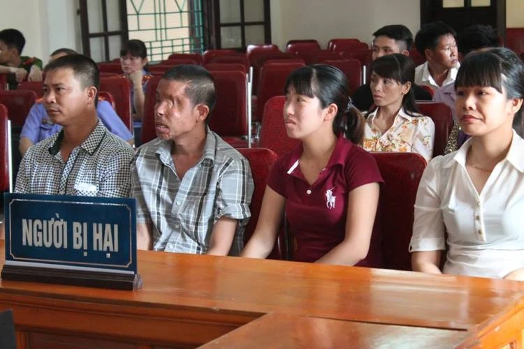 Từ sáng sớm, rất đông người dân đến tham dự phiên tòa. Nhiều người rơi nước mắt khi chứng kiến người bị hại là anh Thái Viết Hảo – bị mìn nổ mù cả hai mắt, cụt hai bàn tay.