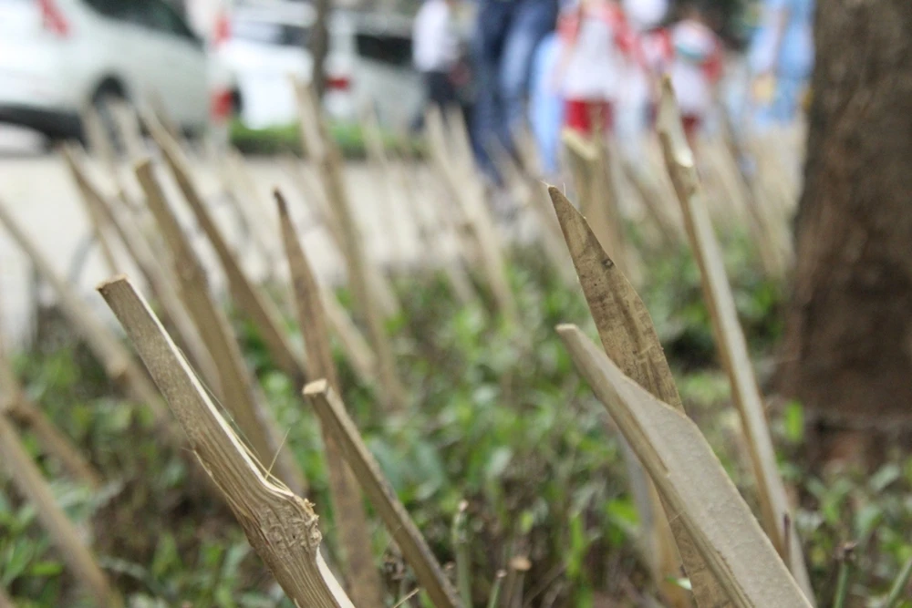 Theo đó, xung quanh các khoảng đất trồng hoa và cây xanh, công nhân của công ty cây xanh đã cắm hàng ngàn cọc tre phía bên ngoài. Điều đáng nói, những cọc này đều được vót rất nhọn, cắm san sát nhau và tạo thành những bàn chông tre.