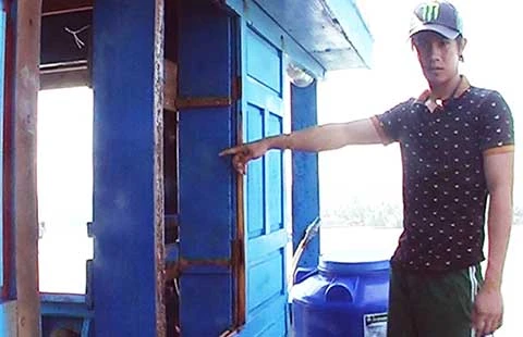 Tàu cá BĐ 96680 TS của ông La Văn Quen bị hư hỏng nặng do bị tàu Trung Quốc tấn công bằng vòi rồng. Ảnh: ÁNH SƯƠNG