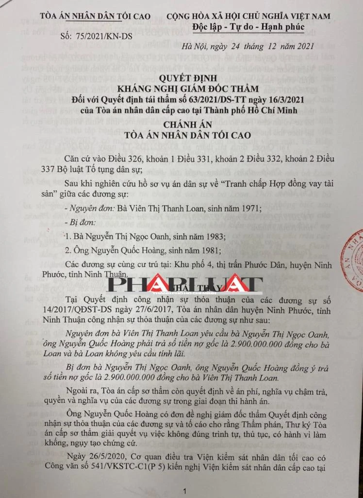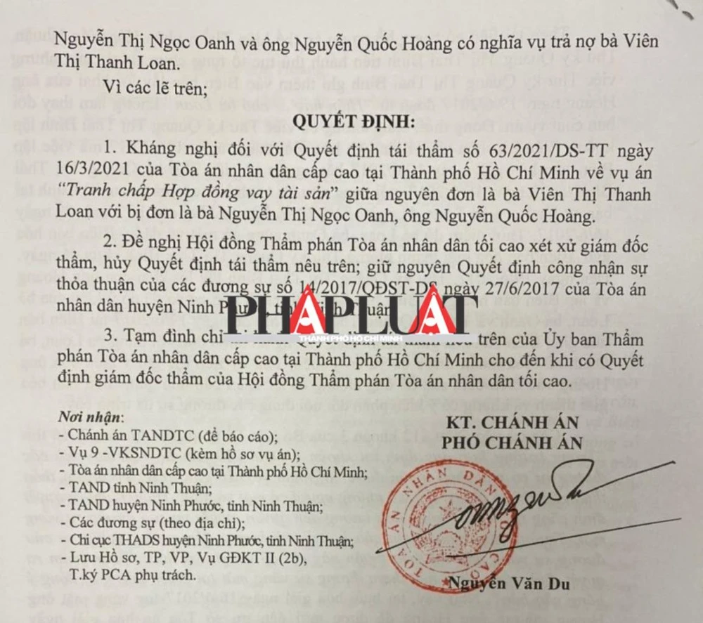 Phó Chánh án Nguyễn Văn Du vừa ký thay Chánh án TAND Tối cao Quyết định kháng nghị giám đốc thẩm đối với Quyết định tái thẩm số 63/2021 của TAND cấp cao TP.HCM trong vụ án dân sự giữa nguyên đơn là Viên Thị Thanh Loan và bị đơn là vợ chồng bà Nguyễn Thị Ngọc Oanh và ông Nguyễn Quốc Hoàng (cùng ngụ khu phố 4, thị trấn Phước Dân, huyện Ninh Phước) mượn 2.9 tỉ đồng chưa trả.
