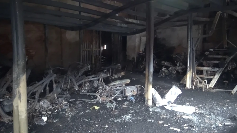 Nhiều xe máy và tài sản bên trong tiệm cầm đồ bị cháy rụi. Ảnh: LÊ ÁNH