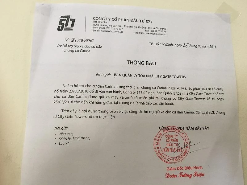 Thông báo gửi ban quản lý tòa nhà City Gate Towers về vấn đề hỗ trợ giữ xe cho cư dân chung cư Carina là Công ty CPĐT 577, có dấu đỏ của giám đốc điều hành Đoàn Tường Triệu.