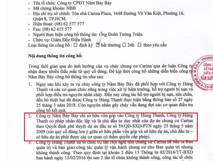 Cụ thể, tại thông báo phát đi ngày 26-3-2018, Công ty 577 khẳng định chỉ sở hữu vốn góp vào Công ty Hùng Thanh. Còn Công ty Hùng Thanh có pháp nhân độc lập và là chủ đầu tư duy nhất của dự án chung cư Carina Plaza theo quyết định phê duyệt dự án đầu tư số 59/QĐ-SXD-PTN ngày 25-5-2009.
