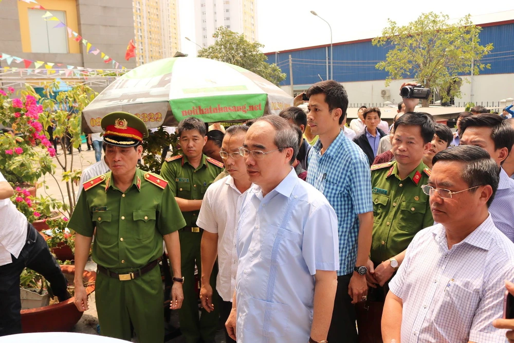 Bí thư Nguyễn Thiện Nhân (ảnh trên), Trung tướng Lê Đông Phong kiểm tra hiện trường vụ cháy.
