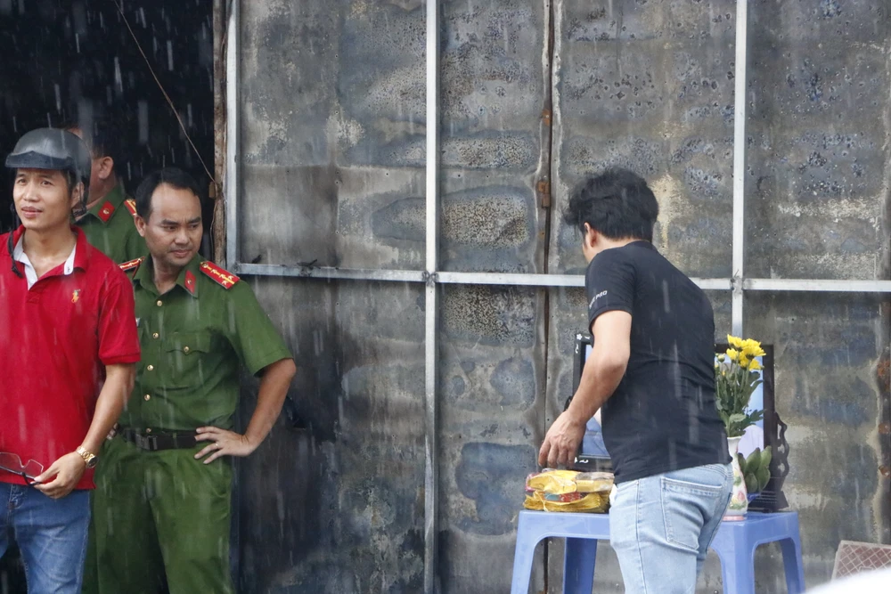 Người nhà nạn nhân Uyên lập bàn thờ trước hiện trường vụ cháy. Ảnh: LÊ ÁNH