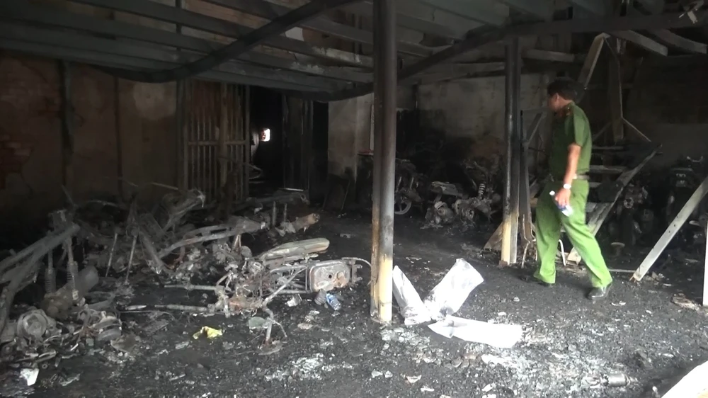 Nhiều xe máy và các tải sản khác bên trong tiệm cầm đồ bị lửa thiêu rụi. Ảnh: LÊ ÁNH
