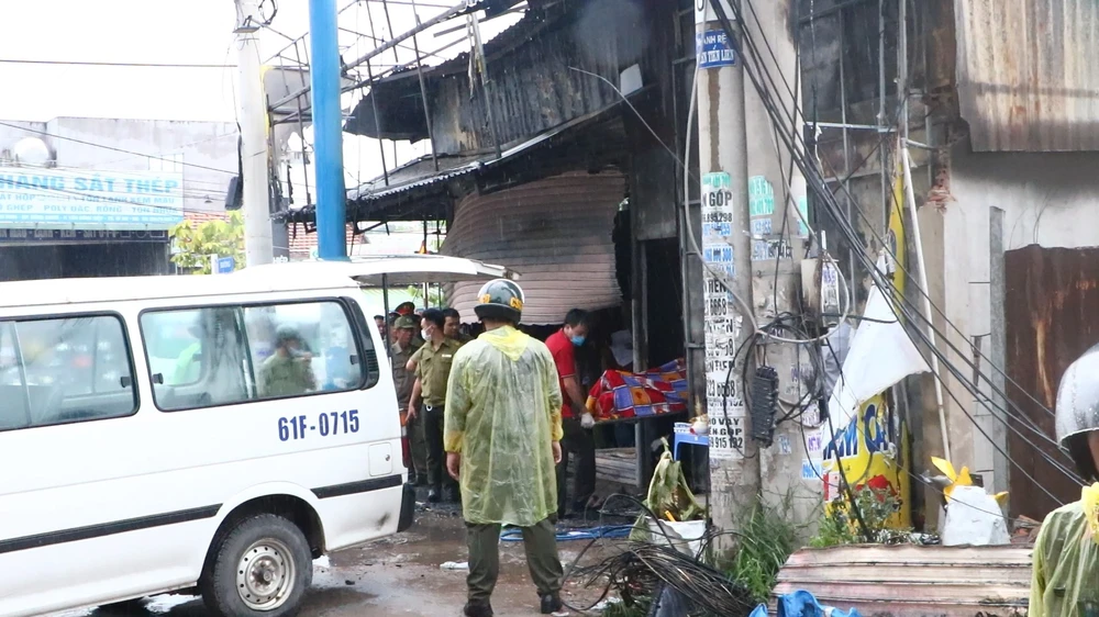| Tiệm cầm đồ cháy trụi, cửa bị khóa trong Khoảng 9 giờ sáng 8-7, sau tiếng nổ lớn, lửa bốc lên từ tiệm cầm đồ Hương Huy Hoàng nằm tại ngã ba Chiêu Liêu (phường Tân Đông Hiệp, TP Dĩ An, Bình Dương).