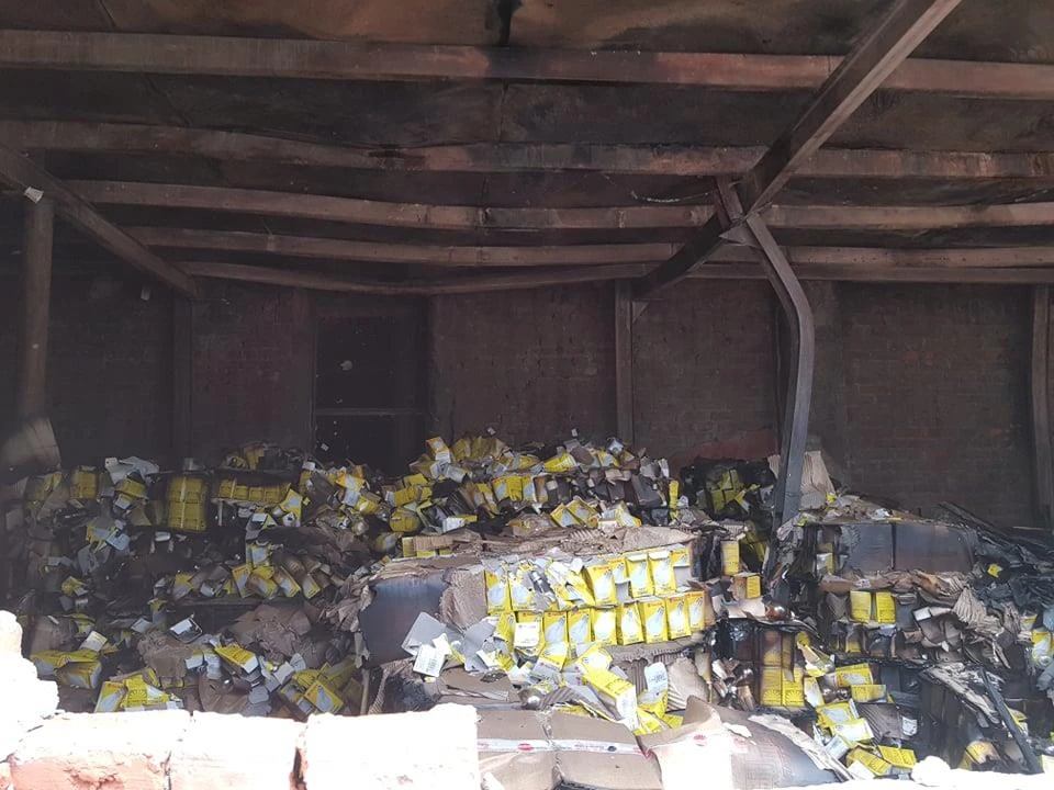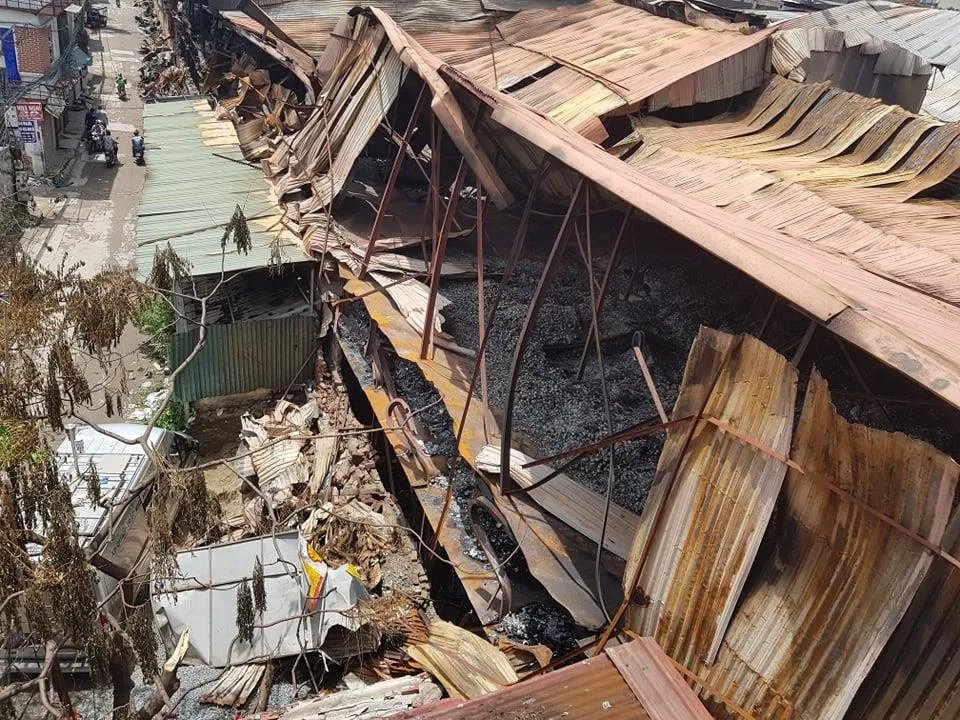 Toàn bộ dãy nhà xưởng hơn 6.000 m2 với mái tôn, tường gạch đều bị lửa nung đến biến dạng, đổ vỡ, xiêu vẹo.