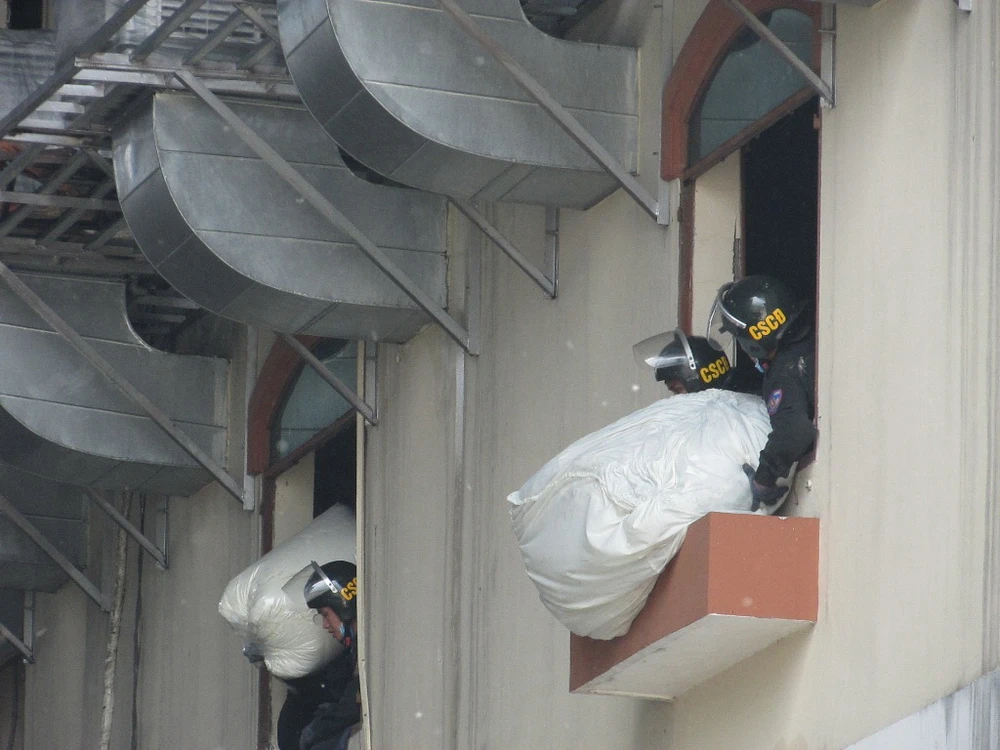 Cảnh sát di chuyển hàng hóa ra khỏi khu vực cháy.