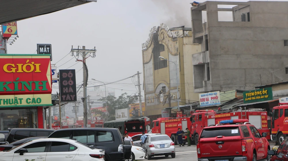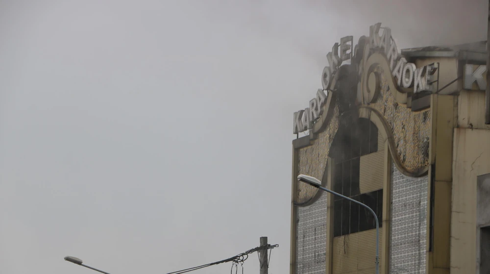 Theo ghi nhận, quán karaoke hiện lại bốc khói nghi ngút, lửa đang bùng phát bên trong khiến công tác cứu nạn bị gián đoạn.