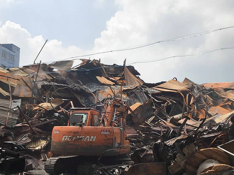 Lực lượng xử lý hiện trường vụ cháy Rạng Đông huy động máy xúc tham gia dọn dẹp tàn dư của vụ cháy