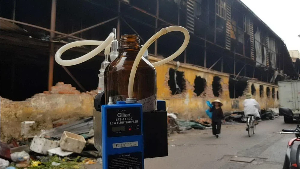 Sở TN&MT TP Hà Nội lắp máy quan trắc môi trường sau sự cố cháy kho hàng của Công ty Rạng Đông. Ảnh: AN HIỀN