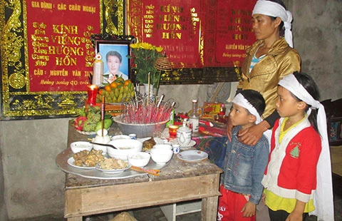 Chị Bình cùng hai con nhỏ bên bàn thờ, di ảnh anh Nguyễn Văn Tình. Ảnh: ĐẮC LAM