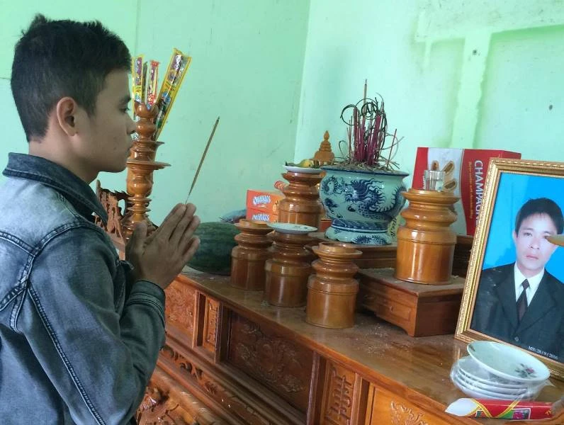 Em Nguyễn Cao Công (20 tuổi, con trai cả nạn nhân Tấn) bên di ảnh người cha của mình.