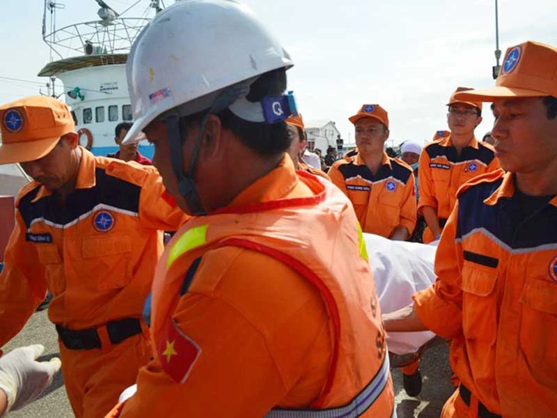 Lực lượng cứu hộ đưa thi thể thuyền viên tàu Hải Thành 26 vào bờ (tháng 3-2017). Ảnh: K.LY