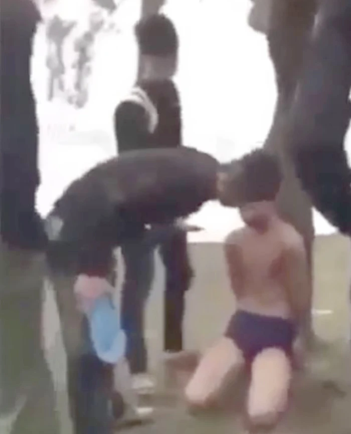 Em V. bị lột hết quần áo ngoài và bắt quỳ bên bờ sông rồi bị một người dùng dép tát. Ảnh cắt từ video clip.