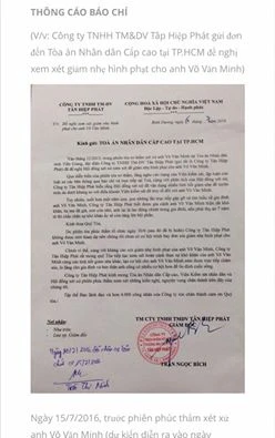 Liên quan đến việc công ty THP xin giảm án cho bị cáo Minh, thẩm phán chủ tọa phiên tòa khẳng định không nhận được văn bản xin giảm án cho bị cáo Minh, tuy nhiên, đại diện công ty Tân Hiệp Phát vừa xác nhận với PV Báo Pháp luật TP.HCM, khẳng định công ty có nộp đơn cho tòa án.