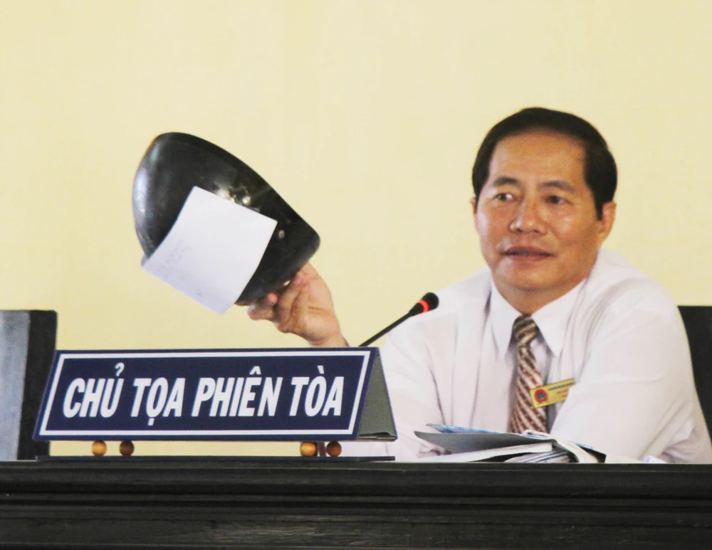 Thẩm phán Đỗ Công Đa, Chánh án TAND huyện Vạn Ninh, chủ tọa phiên tòa, đưa ra tang vật là chiếc mũ bảo hiểm để làm rõ bị cáo Phát có dùng mũ này đánh em Thạch hay không. Ảnh: TẤN LỘC