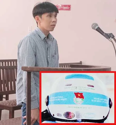 Bùi Minh Lý và chiếc mũ bảo hiểm có in huy hiệu đoàn mà bị cáo cho rằng đã đội trong ngày bị bắt. (Ảnh chụp mũ bảo hiểm cùng kiểu) Ảnh: NGỌC THÂN