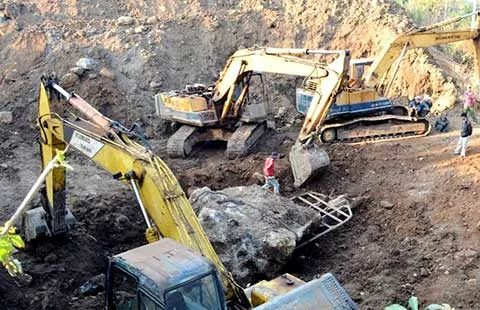 Hiện trường khi phát hiện hòn đá bán quý canxedon nặng gần 30 tấn. Ảnh: Đ.DŨNG