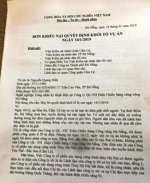 Người viết đơn kêu oan là ông Nguyễn Quang Hiển (36 tuổi, ngụ quận Thanh Khê), công nhân kỹ thuật điện của Công ty Quản lý vận hành hệ thống điện chiếu sáng công cộng (thuộc Sở Xây dựng Đà Nẵng). Ông Hiển bị Công an quận Cẩm Lệ ra quyết định khởi tố về tội thiếu trách nhiệm gây hậu quả nghiêm trọng.