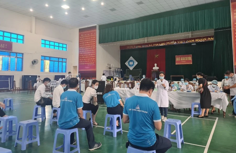 Nhiều người mặc đồng phục của Đất xanh Miền Trung tiêm vaccine COVID-19 vào chiều 30-7. Ảnh: T.NHẬT