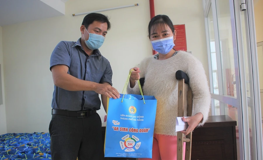 Liên đoàn lao động TP và Công đoàn Khu công nghệ cao và Các khu công nghiệp Đà Nẵng gửi tặng một số phần quà động viên tinh thần cho người lao động. Ảnh: XH