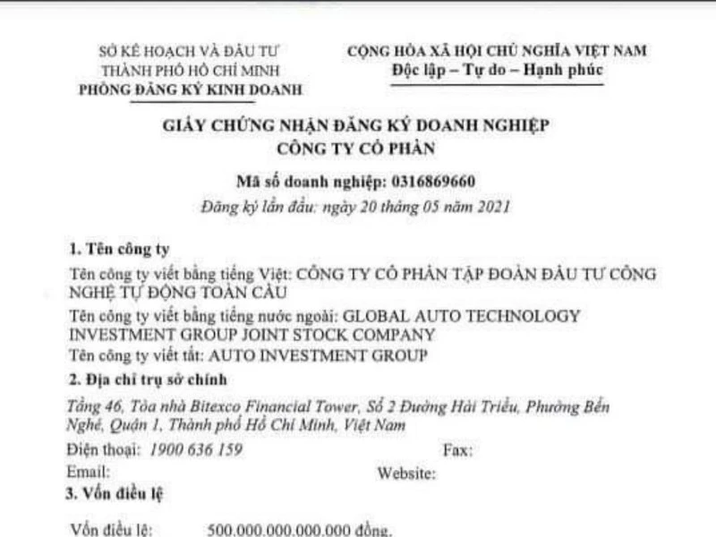 Giấy chứng nhận đăng ký doanh nghiệp có vốn điều lệ 500.000 tỉ đồng. Ảnh: MINH CHUNG/ Sở KH&ĐT TP.HCM cung cấp