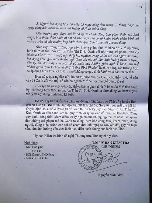 Tiếp đó, việc sa thải bà Oanh theo Luật Lao động là sai. Theo UBKT Tỉnh ủy Bình Phước, các trường hợp để áp dụng hình thức kỷ luật sa thải không có quy định “hành vi tố cáo sai sự thật” như quyết định của Phòng giám định y khoa (GĐYK) sa thải DS Oanh. UBKT Tỉnh ủy kết luận, phòng GĐYK kỷ luật sa thải bà Oanh là không đúng về thẩm quyền xử lý và nội dung hình thức kỷ luật.