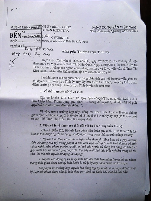 Trong khi đó, vào tháng 12-2013, UBKT Tỉnh ủy đã có báo cáo Thường trực Tỉnh ủy Bình Phước về vụ sa thải sai đối với DS Oanh. Theo UBKT Tỉnh này, về thẩm quyền xử lý vụ việc DS Oanh, UBKT Tỉnh ủy kết luận, theo quy định 45-QĐ/TW của Ban Chấp hành Trung ương: “Không để người bị tố cáo chủ trì giải quyết tố cáo liên quan đến bản thân”. Theo đó, bản thân ông Đoàn Đức Loát, Trưởng phòng giám định y khoa (là người bị tố cáo) lại chủ trì xử lý kỷ luật (sa thải) người tố cáo - DS Oanh.