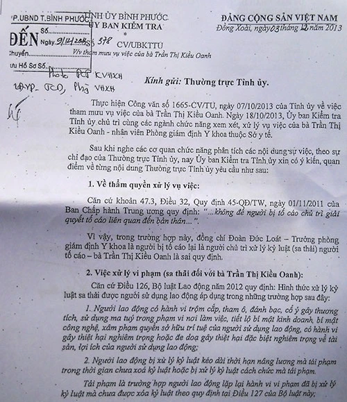 Trong khi đó, vào tháng 12-2013, UBKT Tỉnh ủy đã có báo cáo Thường trực Tỉnh ủy Bình Phước về vụ sa thải sai đối với DS Oanh. Theo UBKT Tỉnh này, về thẩm quyền xử lý vụ việc DS Oanh, UBKT Tỉnh ủy kết luận, theo quy định 45-QĐ/TW của Ban Chấp hành Trung ương: “Không để người bị tố cáo chủ trì giải quyết tố cáo liên quan đến bản thân”. Theo đó, bản thân ông Đoàn Đức Loát, Trưởng phòng Giám định y khoa (là người bị tố cáo) lại chủ trì xử lý kỷ luật (sa thải) người tố cáo- DS Oanh. Tiếp đó, việc sa thải bà Oanh theo Luật Lao động là sai.