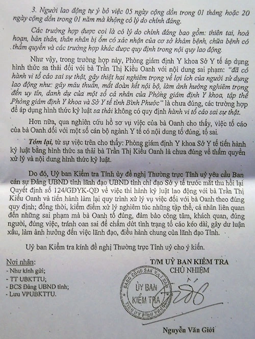 Kết luận của UBKT Tỉnh ủy Bình Phước đề nghị thu hồi quyết định sa thải DS Oanh.