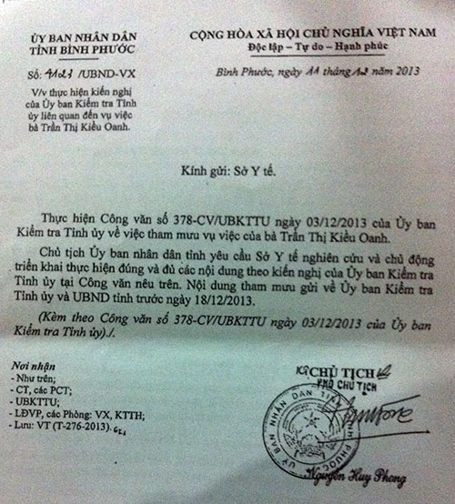 Công văn của UBND tỉnh Bình Phước đề nghị Sở Y tế thực hiện theo kết luận của UBKT Tỉnh ủy Bình Phước. (ảnh NĐ)