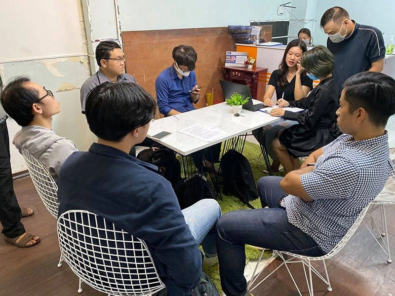 Nhiều giáo viên tìm đến trụ sở của trung tâm Anh ngữ Eagle Corp để đòi lương. Ảnh: TRÚC PHƯƠNG