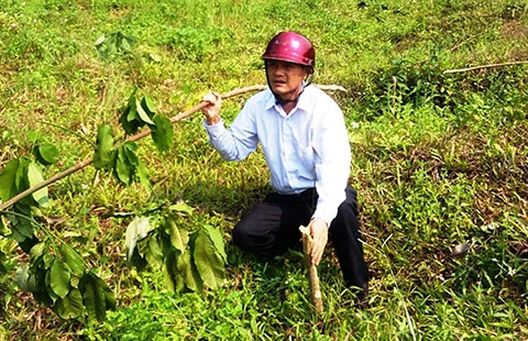 Ông Lê Bá Tâm và rừng cao su ba năm tuổi bất ngờ thành bãi đất trống chỉ sau nửa tháng. Ảnh: Đ.TRUNG