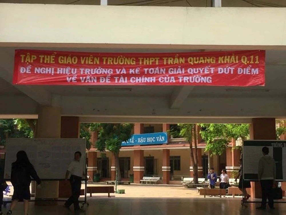 Nội dung băng rôn ghi rõ: “Tập thể giáo viên Trường THPT Trần Quang Khải, quận 11 đề nghị hiệu trưởng và kế toán giải quyết dứt điểm về vấn đề tài chính của trường”.