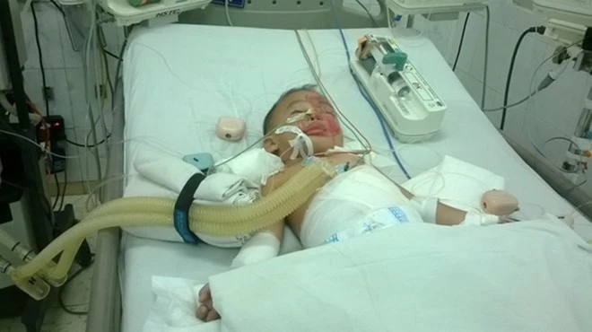 Bé Thiên Hóa đang được điều trị tại Bệnh viện nhi đồng Đồng Nai- Ảnh NLĐO