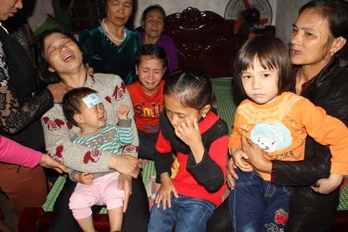 Chị Thơm, vợ anh Thuận khóc ngất bên 4 đứa con gái. Ảnh: Vnexpress