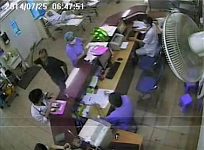 Cảnh cắt từ clip bệnh viện, người áo đen là Nguyễn Tiến Dũng đang cầm vật cứng hành hung các bác sĩ