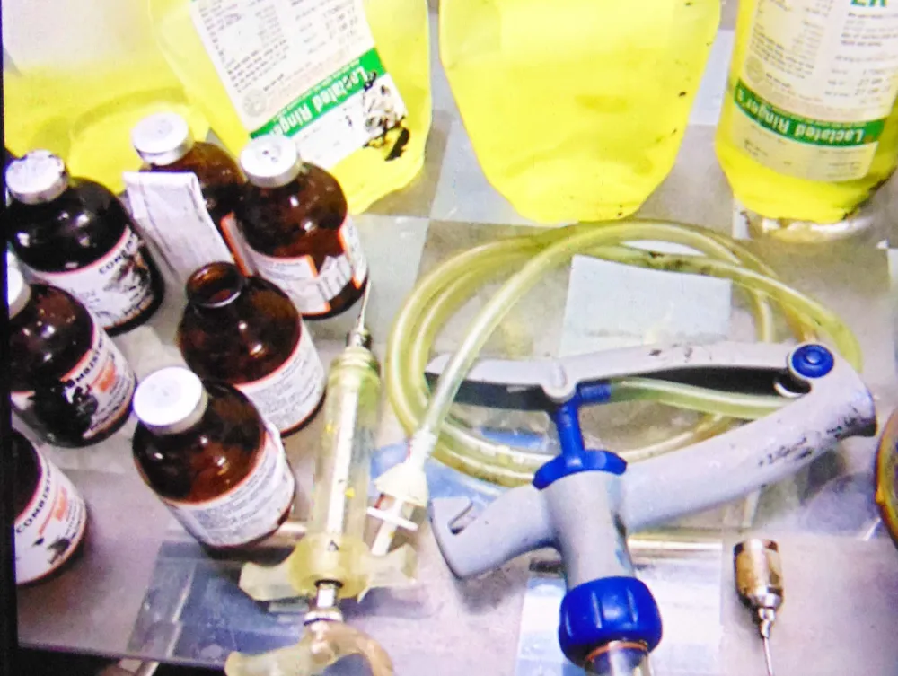 Thuốc an thần Combistress, chai đựng thuốc đã pha với nước truyền dịch, kim tiêm tự động mà các đối tượng đã sử dụng. Ảnh: Thú y TP.HCM.