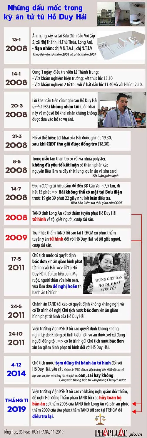| Tạm đình chỉ thi hành án tử hình với Hồ Duy Hải Ngày 22-11-2019, viện trưởng VKSND Tối cao có kháng nghị giám đốc thẩm vụ án Hồ Duy Hải. Kháng nghị đề nghị Hội đồng Thẩm phán TAND Tối cao xét xử theo thủ tục giám đốc thẩm, hủy toàn bộ bản án sơ thẩm năm 2008 của TAND tỉnh Long An và bản án phúc thẩm năm 2009 của Tòa phúc thẩm TAND Tối cao tại TP.HCM đã tuyên Hồ Duy Hải tử hình về hai tội giết người, cướp tài sản để điều tra lại theo đúng quy định của pháp luật. Kháng nghị cũng tạm đình chỉ việc thi hành án tử hình theo quyết định của bản án phúc thẩm đối với Hải. Quyết định kháng nghị mới nhất này thay thế quyết định không kháng nghị của viện trưởng VKSND Tối cao năm 2011. Nội dung vụ án trong bản án phúc thẩm thể hiện năm 2007, Hải quen biết hai nữ nhân viên của Bưu điện Cầu Voi (ấp 5, xã Nhị Thành, huyện Thủ Thừa, Long An) là NTAH và NTTV. Khoảng 19 giờ 30 ngày 13-1-2008, Hải đến Bưu điện Cầu Voi ngồi chơi, nói chuyện. Đến 20 giờ 30, bưu điện nghỉ, Hải đưa tiền cho chị V. đi mua trái cây. Khi chị V. đi, Hải nảy sinh ý định hiếp dâm chị H. nên kéo vào buồng, đẩy chị nằm ngửa xuống ghế (loại xếp). Chị H. phản ứng, đạp vào bụng Hải, chạy về phía cầu thang khu vực bếp. Hải đuổi theo, chị H. kêu lên. Sợ bị phát hiện, Hải dùng tay, thớt đánh vào mặt, bóp cổ, lấy dao giết chị H. Lúc này chị V. đi mua trái cây về cũng bị Hải dùng ghế, dao sát hại. Sau đó Hải mở tủ lấy hơn 1 triệu đồng và một số tài sản rồi bỏ trốn. Theo bản án phúc thẩm, Hải mang một số nữ trang lên TP.HCM bán được 3,7 triệu đồng. Quần áo, dây thắt lưng mang khi gây án Hải đem đốt ở vườn sau nhà một người tên Len để phi tang. Hải cùng mẹ và những người thân trong gia đình ròng rã kêu oan. Năm 2011, viện trưởng VKSND Tối cao quyết định không kháng nghị vụ án của Hải. Quyết định mới cho thấy viện trưởng VKSTC đã thay đổi quan điểm. |