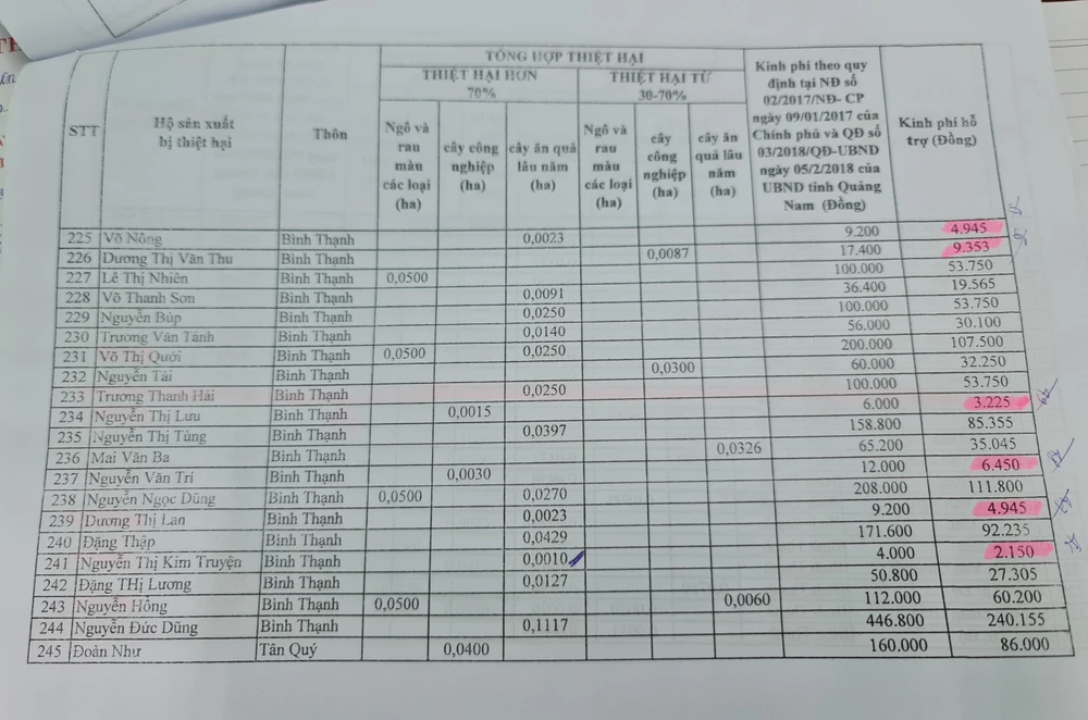 Toàn xã Tam Vinh có 588 trường hợp được hỗ trợ thiệt hại về cây trông, trong đó có 31 trường hợp được hỗ trợ dưới 10.000 đồng. Trường hợp của bà Truyện được hỗ trợ 2.000 đồng là thấp nhất.