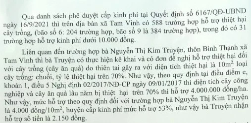 Sau đó, UBND xã Tam Vinh có báo cáo cụ thể. Theo đó, trường hợp được hỗ trợ 2.000 đồng là bà Nguyễn Thị Kim Truyện (ngụ thôn Bình Thạnh, xã Tam Vinh). Bà Truyện kê khai và có đơn đề nghị hỗ trợ thiệt hại đối với cây trồng (cây chuối) là 10m2, thiệt hại trên 70%.