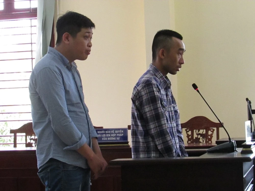 Hai bị cáo Hùng Anh (áo ca-rô) và Hậu tại phiên tòa phúc thẩm ngày 28-6. Ảnh: NN