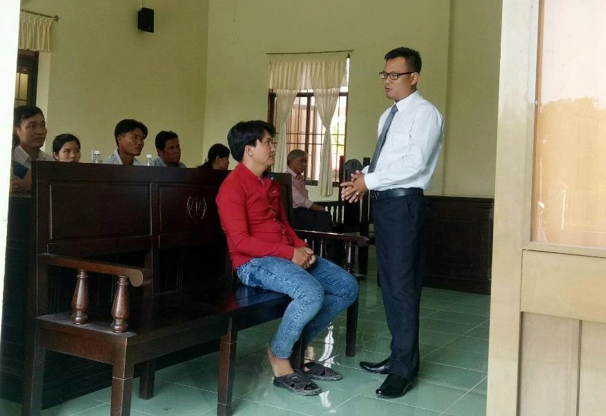 Huỳnh Hữu Nhơn cùng luật sư tại tòa. Ảnh: HD