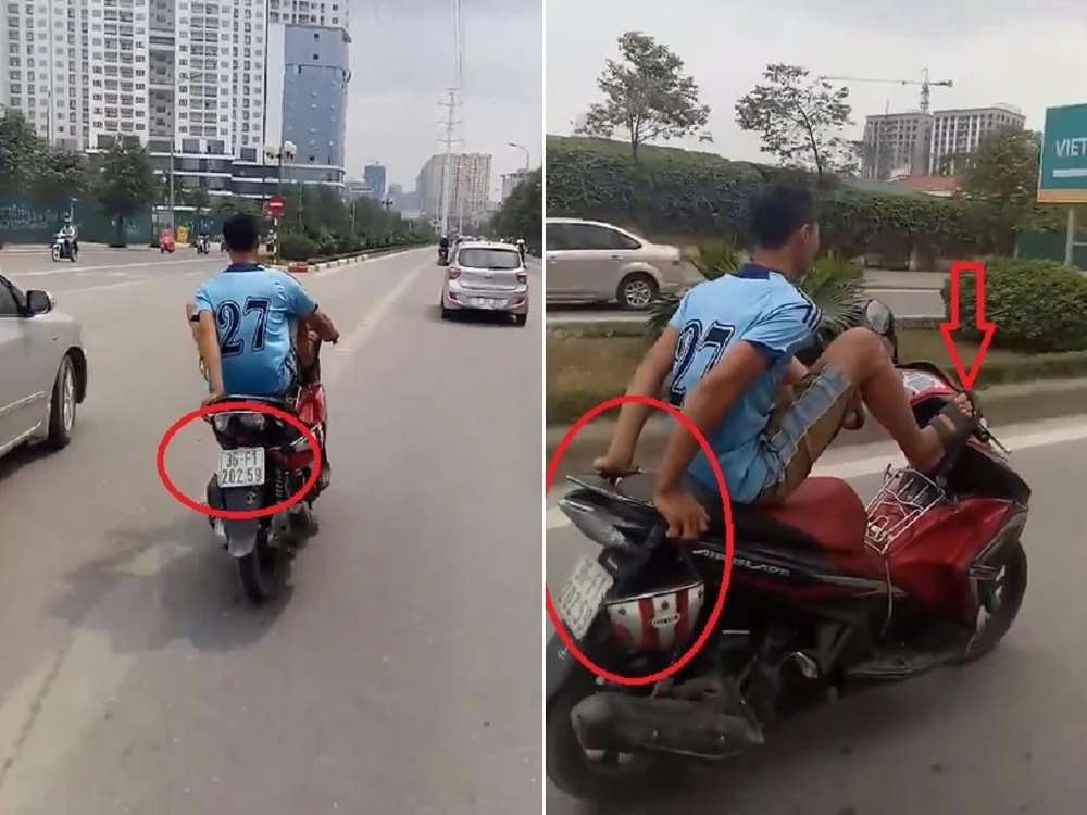 Thiếu tá Thắng cho biết thêm: Căn cứ vào đoạn clip đăng tải, có thể người điều khiển xe máy vi phạm các lỗi như không đội mũ bảo hiểm, đi sai làn và điều khiển xe máy bằng chân.