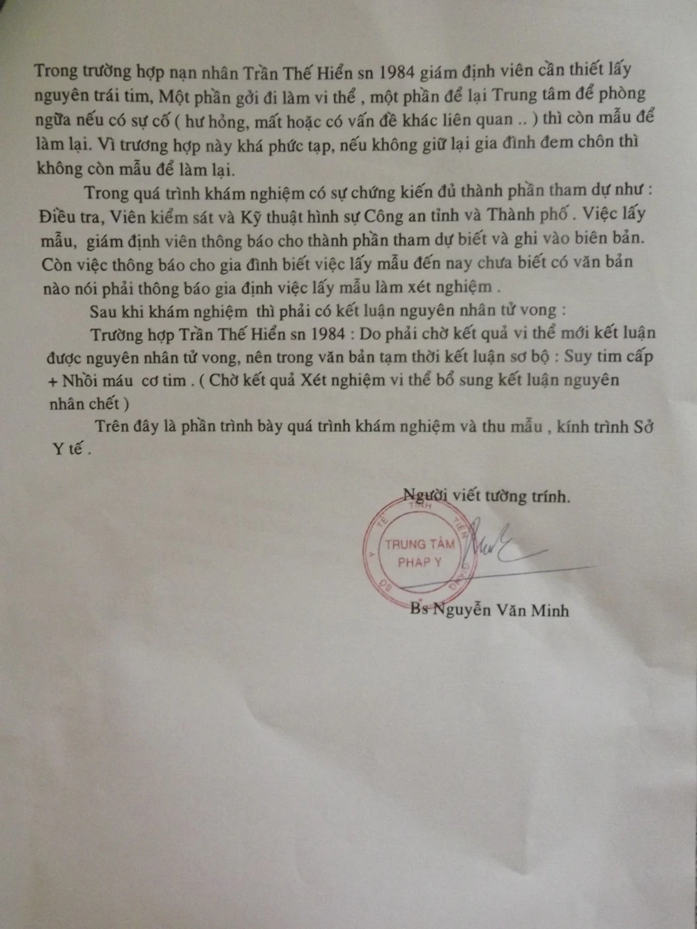 Theo báo cáo giải trình ngày 11-1 của bác sĩ Minh, đối với trường hợp của anh Trần Thế Hiển (30 tuổi ngụ ấp Mỹ Hòa, xã Mỹ Phong, nạn nhân sau vụ hỗn chiến giữa hai nhóm thanh niên ngày 6-1), “giám định viên cần thiết phải lấy nguyên trái tim, một phần gửi đi làm vi thể và một phần để lại trung tâm để phòng ngừa nếu có sự cố hư hỏng, mất mát hoặc có vấn đề khác liên quan thì còn mẫu để làm lại. Vì trường hợp này khá phức tạp, nếu không giữ lại, gia đình đem chôn thì không còn mẫu để làm lại”.